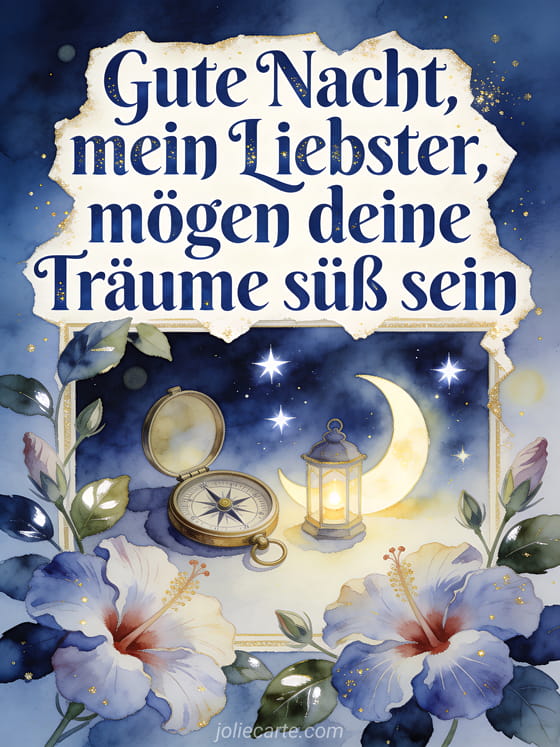 Wünsche gute Nacht mit einem alten Kompass, einer kleinen Mondsichellaterne, hellen Sternen und Hibiskusblüten in ruhigem Aquarellnachtlicht. Du kannst auch die schönste Gute-Nacht-Nachricht, eine kostenlose virtuelle Gute-Nacht-Karte oder eine Gute-Nacht-Karte Küsse senden.