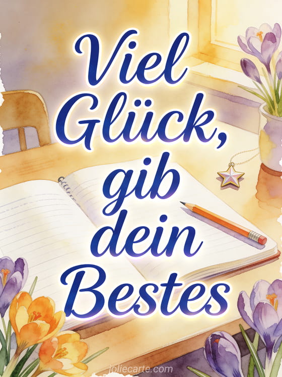 Wünsche viel Glück und ermutige jemanden, sein Bestes zu geben, mit einem ordentlichen Lerntisch, offenem Notizbuch, gespitztem Bleistift, Glücksstern und frischen Krokusblüten. Teile diese ermutigende Karte und entdecke auch Viel-Glück-Nachricht für einen neuen Job, viel Glück animiertes GIF oder Viel Glück Bild GIF.