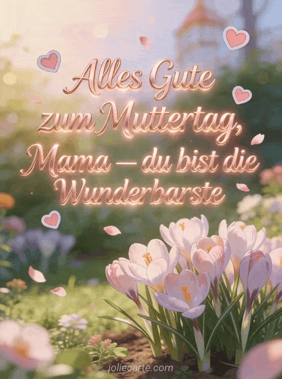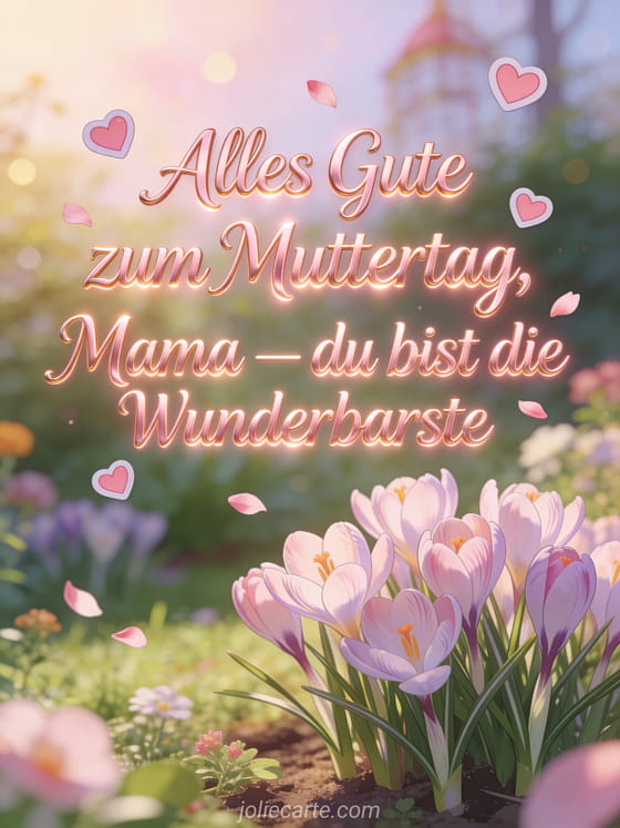 Sagen Sie Mama, dass sie die Wunderbarste ist, mit dieser wunderschönen Nachricht zum Muttertag mit eleganter Roségold-Kalligraphie und blühenden Krokussen in einem Traumgarten. Entdecken Sie auch Frohen Muttertag meine Liebe oder Bilder schönen Muttertag.