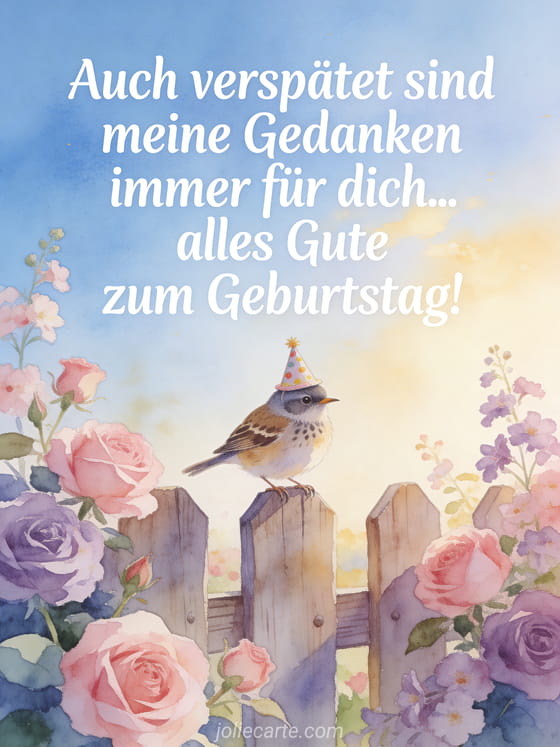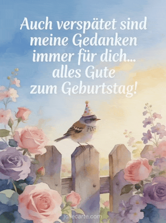 Auch wenn du etwas zu spät dran bist, kannst du mit dieser kostenlosen Karte deine herzlichsten Geburtstagsglückwünsche übermitteln. Entdecke auch einen nachträglichen Geburtstag GIF, einen nachträglichen Geburtstagstext oder verspätete Geburtstagsglückwünsche an einen Freund.