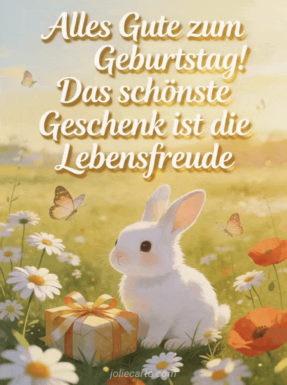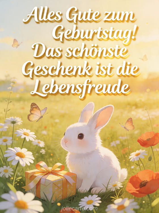Sende einen zarten Geburtstagswunsch mit dieser süßen Karte mit einem kleinen weißen Hasen auf einer blühenden Wiese mit Margeriten, Mohnblumen, Schmetterlingen und einem verpackten Geschenk. Entdecke auch schöne Geburtstagsnachricht, origineller Geburtstagsspruch und kostenlose originelle virtuelle geburtstagskarte.