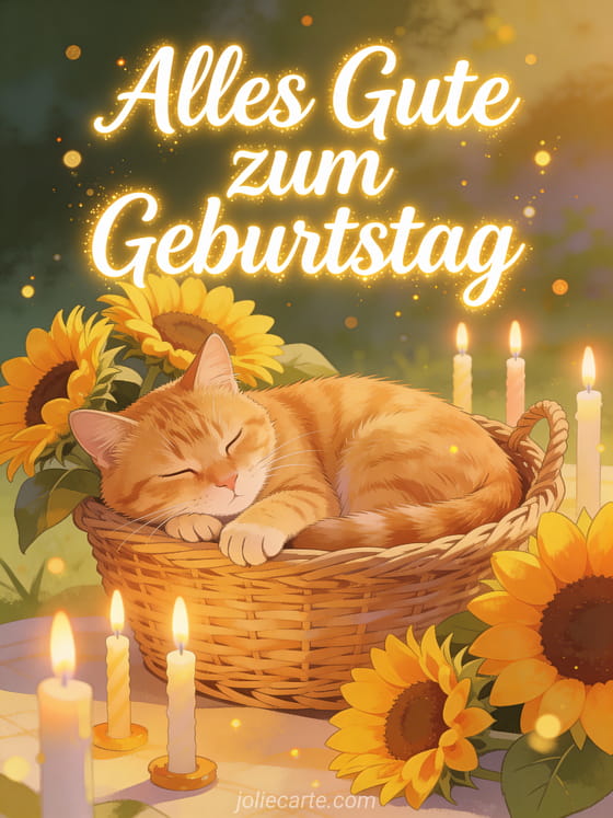 Versenden Sie einen zärtlichen Geburtstagsgruß mit dieser gemütlichen Karte mit einer roten Katze, die zwischen Sonnenblumen und Geburtstagskerzen schläft. Entdecken Sie auch eine Geburtstagskarte Feuerwerk oder eine Geburtstagskarte Berglandschaft oder eine Geburtstagskarte genieße jeden Augenblick.