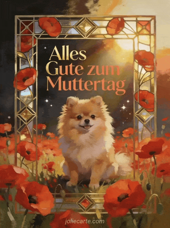 Begeistere mit dieser einzigartigen Muttertagskarte mit einem Zwergspitz auf einem lebhaften Mohnblumenfeld im goldenen Stundenlicht. Entdecke auch eine kostenlose Muttertagskarte oder ein Muttertagsgif.