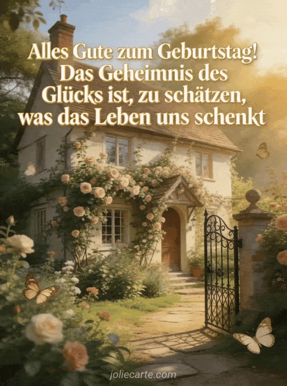 Überrasche mit einem originellen Geburtstagsspruch auf dieser eleganten Vintage-Karte mit englischem Cottage, Kletterrosen, Schmetterlingen und warmem Nachmittagslicht. Entdecke auch kostenlose originelle virtuelle geburtstagskarte, originelle geburtstagskarte und originelle virtuelle geburtstagskarte.