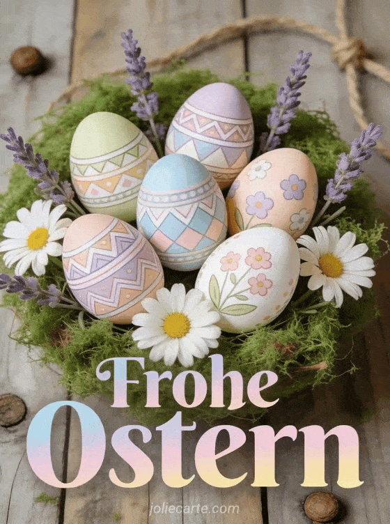 Sende diesen frohlichen Frohe Ostern Gruss mit bemalten Eiern mit geometrischen und floralen Mustern in grunem Moos mit Lavendel und Margeriten. Entdecke auch eine Ostertext-Karte oder eine Oster-Nachrichtenkarte.