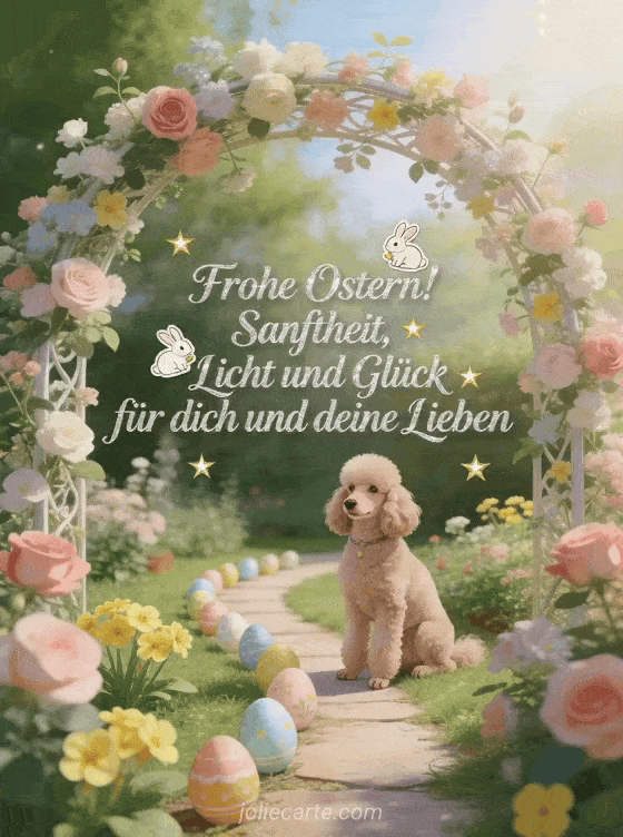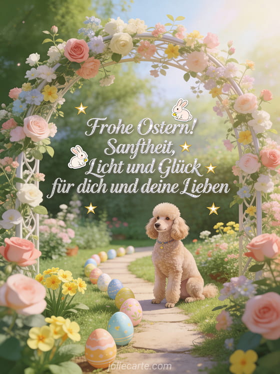 Senden Sie diese elegante Ostergrusskarte mit einem stolzen Pudel in einem bluehenden Garten mit Rosen und Primeln, einem dekorativen Fruehlingsbluetenbogen, bemalten Ostereiern entlang eines Gartenwegs und sanftem aetherischem Licht. Entdecken Sie auch eine Karte frohe Osterfeiertage, eine Osterkarte oder eine virtuelle Osterkarte.
