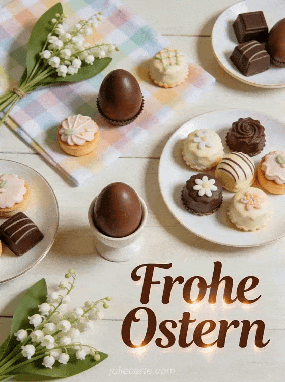 Verschicken Sie eine charmante Osterkarte mit einem Ostertisch voller Schokoladeneier und Gebäck. Entdecken Sie auch einen Ostertext oder ein animiertes Oster GIF.