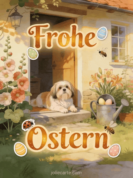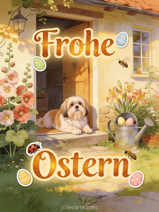 Feiern Sie Ostern mit dieser wunderschonen Karte mit einem entzuckenden Lhasa-Apso-Hund in einem landlichen Garten voller Blumen und bunter Ostereier. Entdecken Sie auch eine Oster-Grusskarte oder ein Ostervideo.