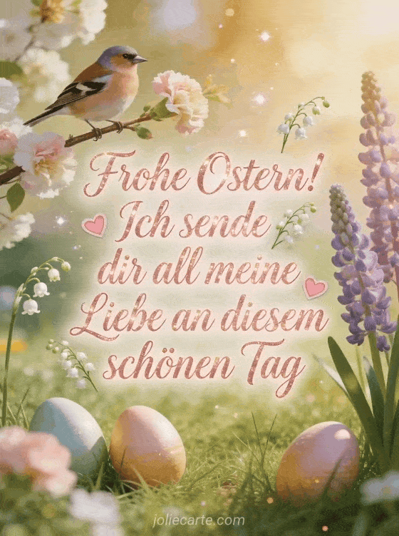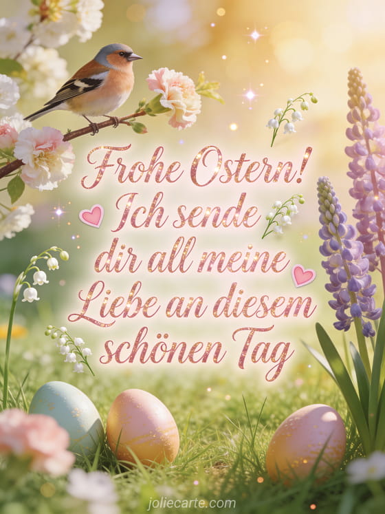 Senden Sie diese schoene Osternachricht an Ihre Lieben, mit einem Gimpel auf einem Zweig mit Nelken und Lupinen, Ostereiern im frischen gruenen Gras und goldenen Funken. Eine warme romantische Illustration. Entdecken Sie auch ein kostenloses Osterbild, eine kostenlose Osterkarte fuer Facebook oder eine Osterkarte.