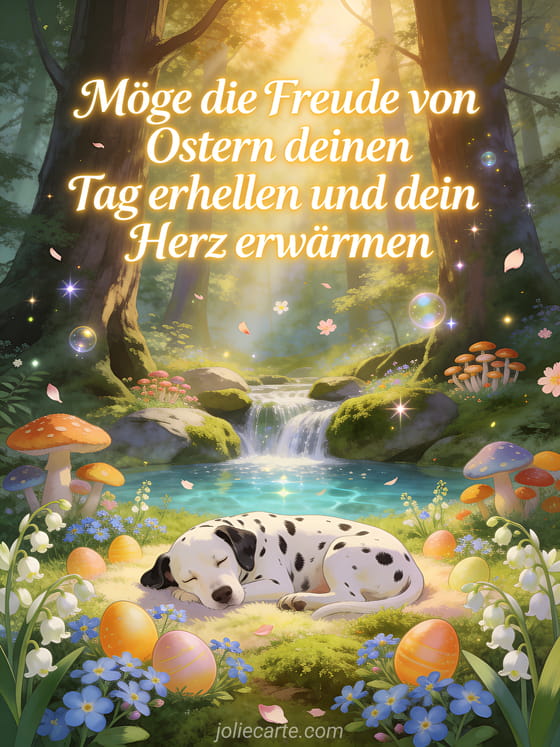 Teile diesen zarten Ostertext mit einem Dalmatiner im Frühlingswald mit Maiglöckchen. Entdecke auch animiertes Oster GIF oder Frohe Ostern Bild kostenlos.