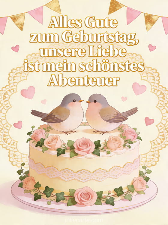 Feiere die Liebe mit dieser romantischen Geburtstagskarte mit zwei Turteltauben auf einem dekorierten Kuchen, Rosen, schwebenden Herzen und goldenen Wimpeln. Entdecke auch alles gute zum geburtstag mein herz, alles gute zum geburtstag meine liebe berührender text fernbeziehung oder Herz Herz alles Gute zum Geburtstag mein Schatz.