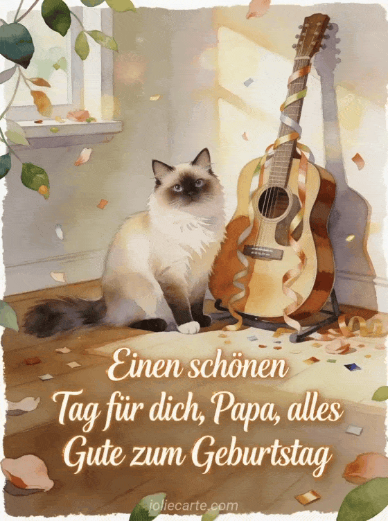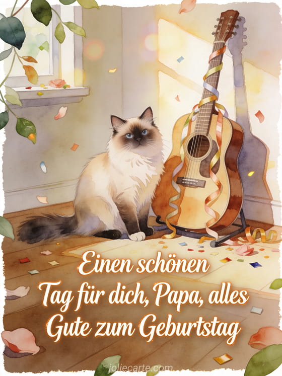 Teile eine Geburtstagszeichnung für Papa mit einer Birma-Katze neben einer Akustikgitarre mit Geburtstagsschleifen in einer sonnigen Werkstattecke. Dazu passen deine Tochter alles Gute zum Geburtstag Papa von deiner Tochter, Brief zum Geburtstag für Papa oder Alles Gute zum Geburtstag mein geliebter Papa.