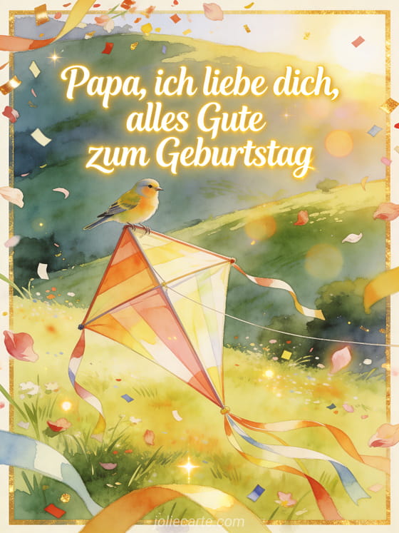 Teile eine Botschaft mit papa ich liebe dich alles gute zum geburtstag in einer sonnigen Aquarellwiese, mit einem Girlitz auf einem riesigen festlichen Drachen und Schleifen, Blütenblättern und Konfetti am Rand. Dazu passen Papas Geburtstag, Papa Geburtstagszeichnung oder deine Tochter alles Gute zum Geburtstag Papa von deiner Tochter.