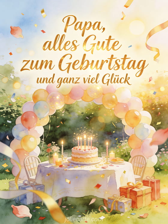 Sende Papa ich wünsche dir alles Gute zum Geburtstag mit feiner cremefarbener Schrift, einem großen Ballonbogen um einen funkelnden Geburtstagstisch in einem sonnigen Garten, dazu Blüten, Schleifen und Konfetti über dem Rand. Entdecke auch eine Alles Gute zum Geburtstag Papa Karte, animierte Bilder alles Gute zum Geburtstag Papa oder ein Geburtstagsgedicht Papa Kind.