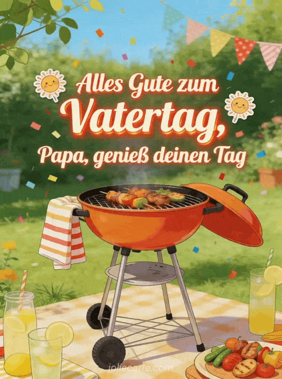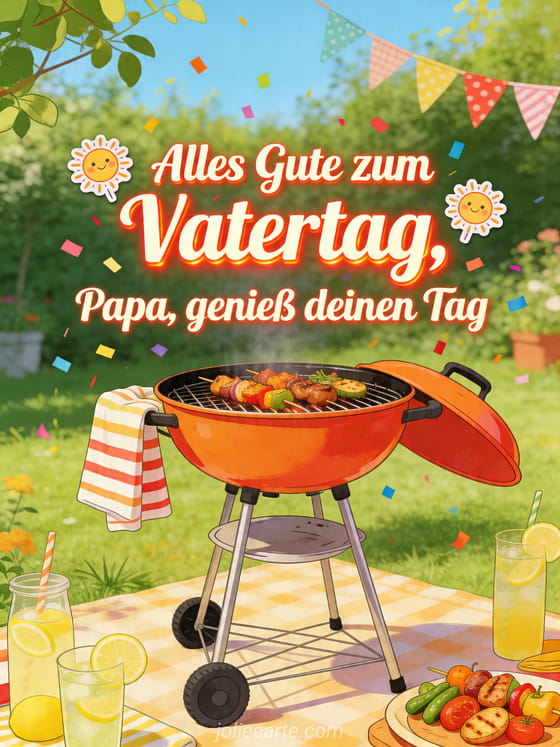 Wünsche Papa einen sonnigen Tag mit einer lebhaften Illustration von Grill, Limonade, geröstetem Gemüse und festlichen Girlanden im Garten. Du kannst auch Alles Gute zum Vatertag mein Liebling, ein Vatertagsbild kostenlos oder eine Karte für Vatertag senden.
