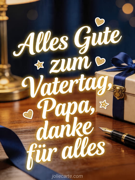 Versende eine personalisierte Vatertagskarte mit cremefarbener Kalligrafie, kleinen Herz- und Sternaufklebern, einem polierten Holztisch, Füllfederhalter, versiegelter Geschenkbox, Messingakzenten und tiefblauer Schleife. Entdecke auch Grüße zum Vatertag, eine Vatertagskartenvorlage oder eine einfache Vatertagskarte.