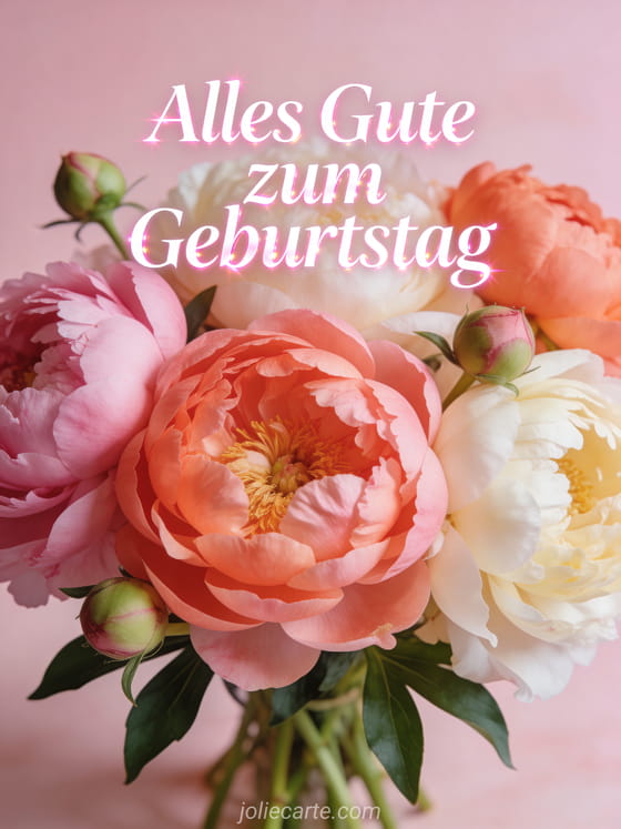 Feiern Sie ihren Geburtstag mit dieser beeindruckenden Karte, die einen luxuriösen Strauß Pfingstrosen in Rosa-, Korall- und Cremeweißtönen mit zarten Knospen und grünem Laub auf zartrosa Hintergrund zeigt. Entdecken Sie auch einen Geburtstagsstrauß Frau oder Geburtstag Frau Blumen.