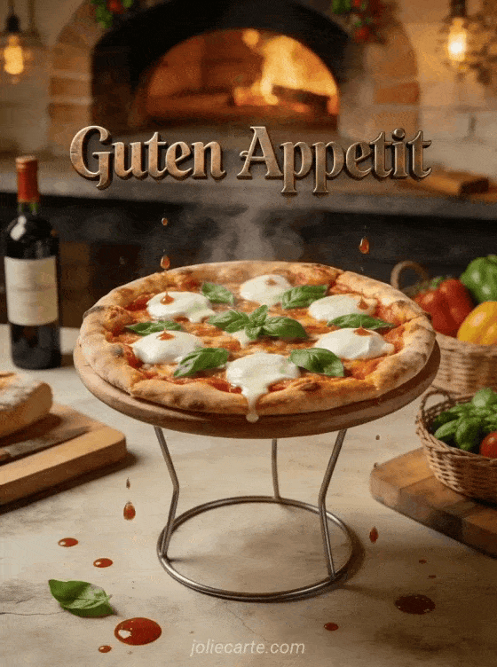 Schicke jemandem eine köstliche Guten-Appetit-Karte mit einer frischen Pizza margherita aus dem Holzofen. Entdecke auch eine Mahlzeit-Guten-Appetit-Bildkarte oder eine Guten-Appetit-GIF-Karte.