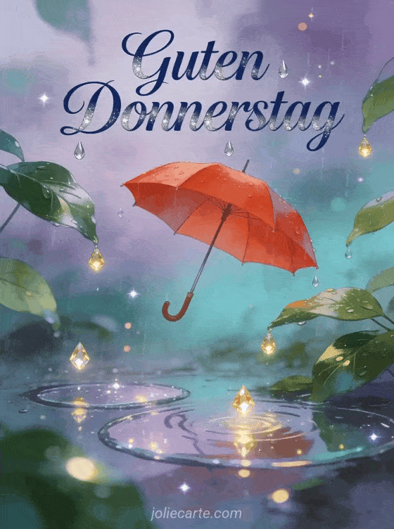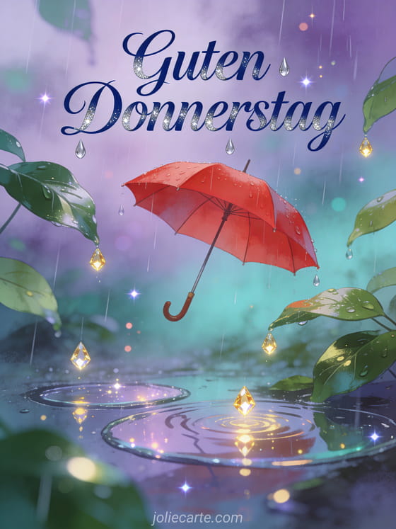Teile einen herzlichen Donnerstagswunsch mit dieser magischen Karte mit einem roten Regenschirm unter funkelnden Regentropfen. Entdecke auch guter Donnerstag Küsse oder Bild schöner Donnerstag Zen für mehr Donnerstagsinspiration.