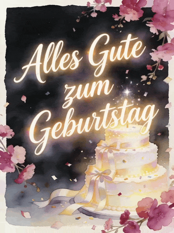 Teile eine fröhliche Geburtstagskarte mit elfenbeinfarbener Kalligrafie, herabfallenden Fuchsienblüten, einem leuchtenden Etagenkuchen, Satinschleifen und funkelndem Konfetti. Der Aquarellrand und die Blütenebenen geben diesem Gruß eine helle romantische Stimmung. Entdecke auch ein Alles Gute zum Geburtstag mein Liebling GIF, Geburtstag verliebtes Paar oder Geburtstag mein Schatz.