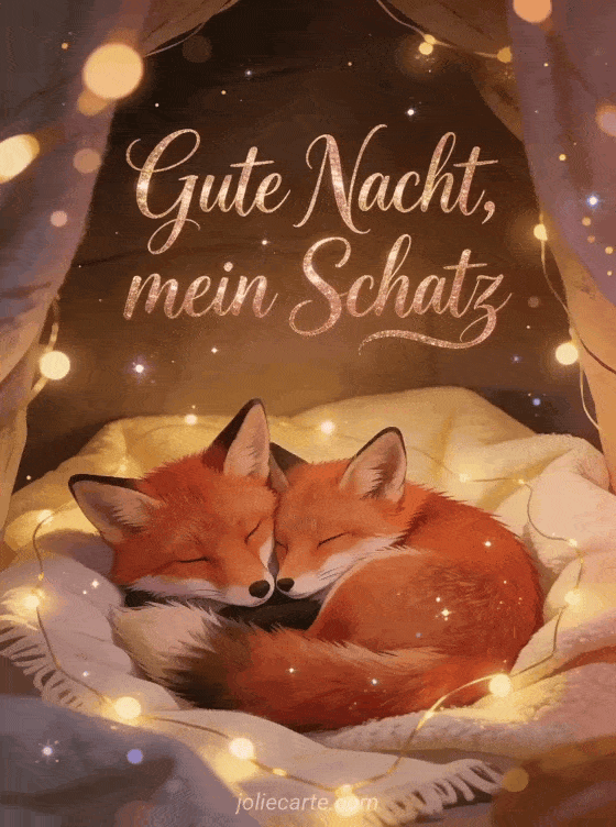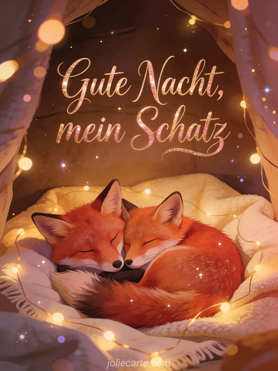 Sende einen romantischen Gutenachtwunsch an die Liebe deines Lebens mit dieser kostenlosen Karte. Ein kuscheliges Fuchspärchen unter Lichterketten, perfekt für eine zärtliche Gutenacht. Entdecke auch eine Karte ich liebe dich gute nacht mein schatz oder eine Karte gute nacht ich liebe dich mein schatz gif.