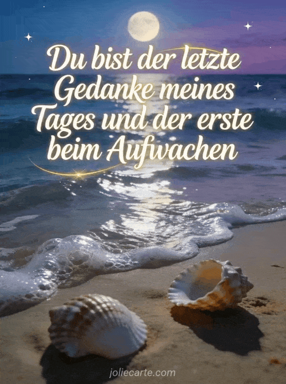 Teile ein zärtliches Gute-Nacht-Gefühl mit dieser poetischen romantischen Karte am mondbeschienenen Ozean. Entdecke auch bild gute nacht mein liebling, liebesnachricht gute nacht oder Gute Nacht zärtliche Liebe.