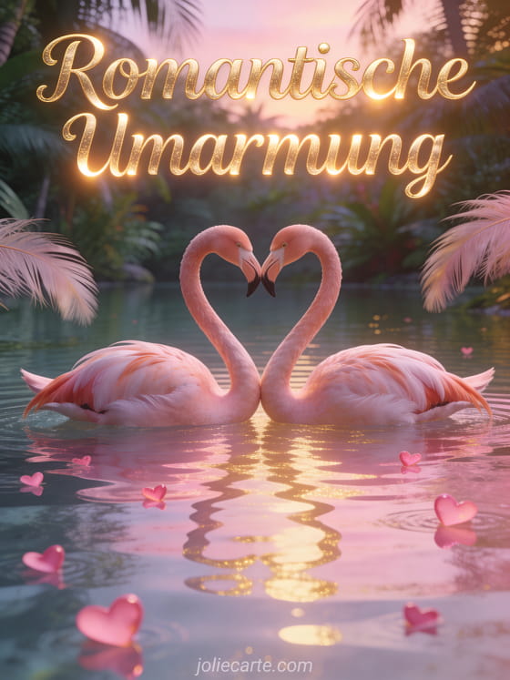 Sende diese romantische Karte mit dem Text Romantische Umarmung in goldenen Kursivbuchstaben mit warmem Lichteffekt, mit zwei Flamingos, die mit ihren HĂ€lsen ein Herz an einem See in der DĂ€mmerung formen, mit rosa und goldenen Spiegelungen im Wasser. Entdecke auch eine Karte Umarmung Liebespaar schlafen oder eine ZĂ€rtlichkeit Bild Umarmung.