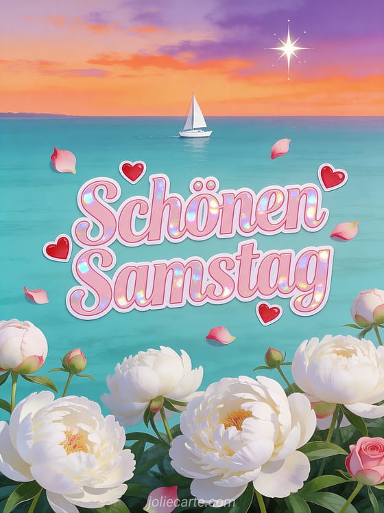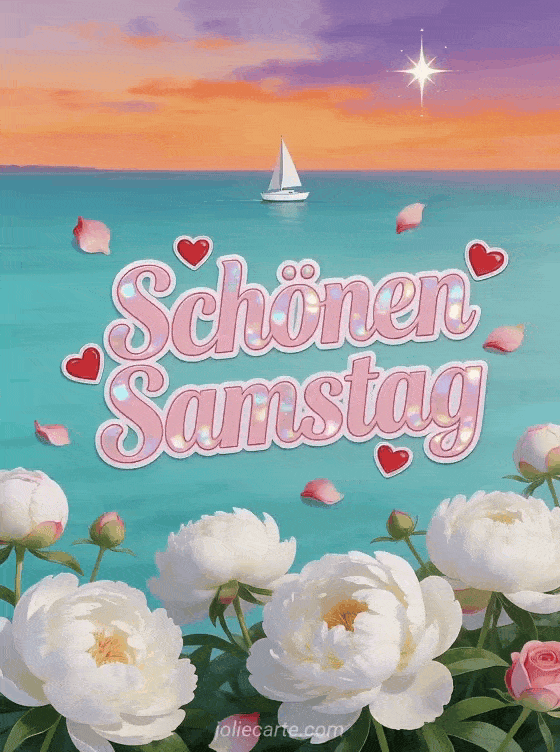 Teilen Sie eine romantische Karte zum schönen Samstag mit puderrosa Perlmutt-Schrift, kleinen roten Herzen, Rosenblättern, einer türkisfarbenen Bucht in der Dämmerung, einem kleinen weißen Segelboot, das friedlich fährt, und weißen Pfingstrosen im Vordergrund unter rosa, orange und violettem Himmel. Sehen Sie auch schönen Samstag schönes Wochenende, Guten Morgen schönen Samstag animierte GIFs oder Smiley schönen Samstag.