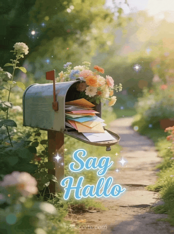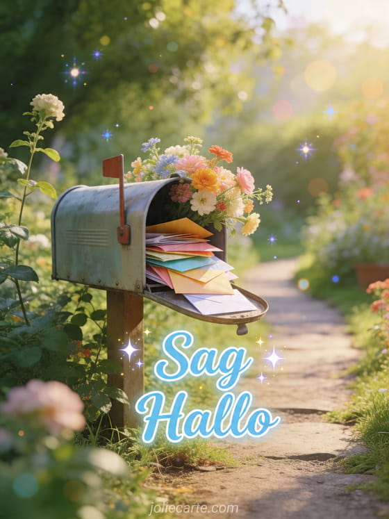 Teilen Sie diese charmante Karte sag hallo mit einem alten Briefkasten, bunten Briefen, Blumen und warmer Botenstimmung. Entdecken Sie auch hallo, hallo mama und guten morgen an seinen schatz.