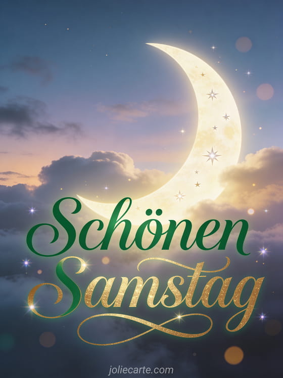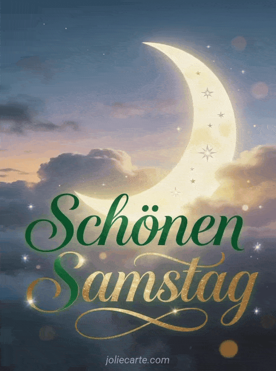 Teile einen friedlichen Gruß zum schönen Samstag mit einer zarten Mondsichel, Sternen und weichen Wolken in einem Dämmerungshimmel mit sanftem Licht. Entdecke auch ein Schönen Samstag Kaffee GIF, GIFs Schönen Samstag oder schönen Karsamstag.