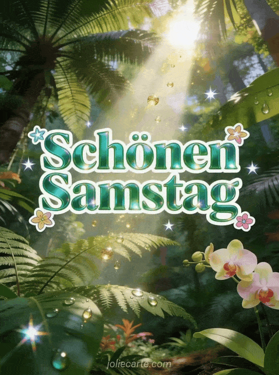 Sende Samstag Küsschen Bilder mit smaragdgrünen Buchstaben, funkelnden Sternen und einem üppigen tropischen Wald, der von einem majestätischen Sonnenstrahl durchbrochen wird. Teile einen zarten Wochenendwunsch und entdecke auch schönen Samstagabend Küsse, animiertes GIF Guten Morgen es ist Samstag oder Schönen Samstag Freunde GIFs.