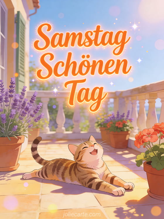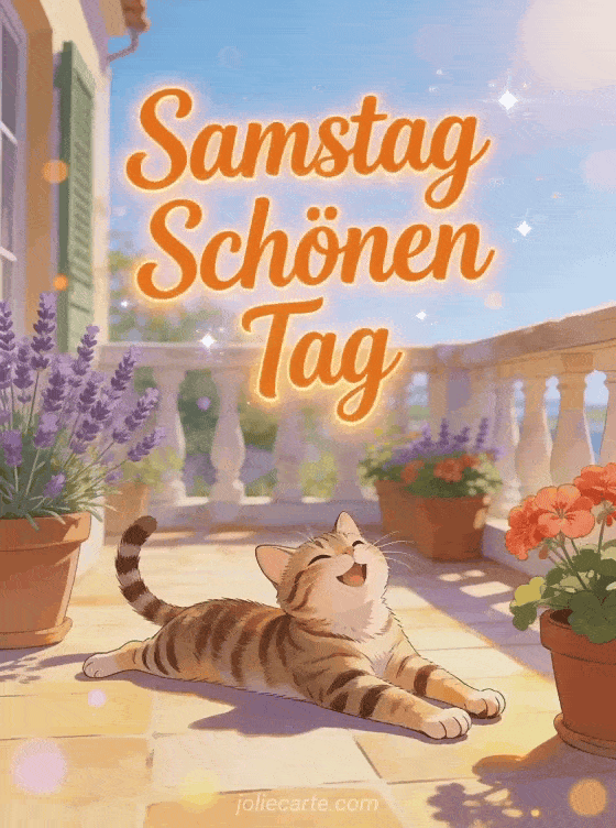 Wünsche jemandem einen wunderbaren Samstag mit dieser fröhlichen Karte mit einer Tigerkatze. Entdecke auch eine schönen samstag und schönes wochenende Karte oder eine schönen samstag sonnig küsse Karte.