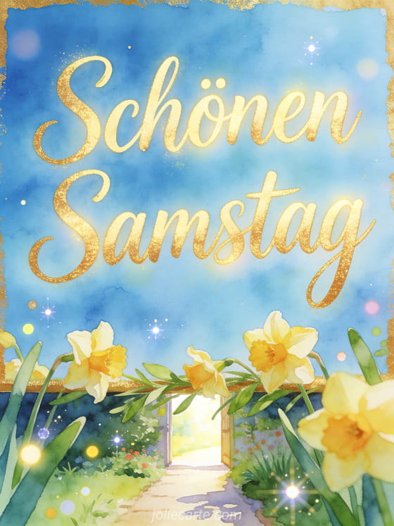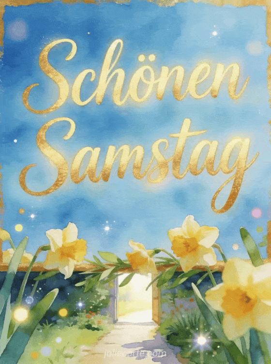 Sende ein Bild für einen schönen Samstag mit himmelblauer Schrift, Narzissen und einem sonnigen Gartenweg. Du kannst auch schönen samstag gif bilder, eine Karte für schönen tag und schönen samstag oder einen schönen samstag teilen.