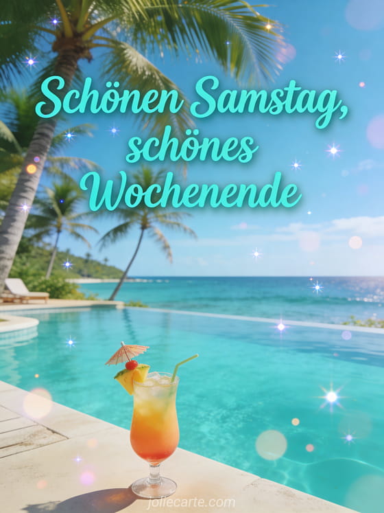 Teile einen sonnigen Gruß zum schönen Samstag und Wochenende mit einem schönen Infinity-Pool mit Blick auf den tropischen Ozean, Palmen und einem exotischen Cocktail. Entdecke auch Guten Morgen schönen Samstag Bilder, schönen Samstag im Warmen oder Guten Morgen schönen Tag schönen Samstag.