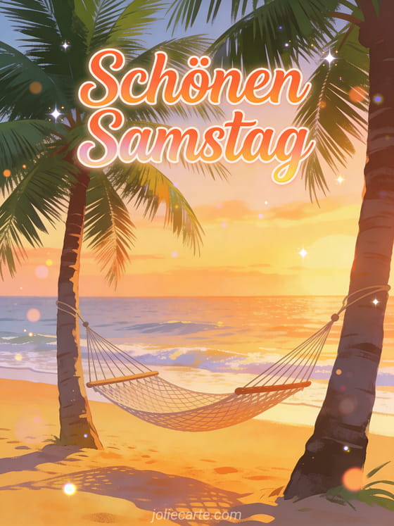 Teile Samstag schönes Wochenende mit einer Hängematte zwischen Palmen am Strand in der perfekten Entspannungsszene fürs Wochenende. Setze die sonnige Stimmung fort mit Samstag schönes Wochenende schönen Samstag, Guten Morgen schönen Samstag Bilder oder schönen Samstag im Warmen.