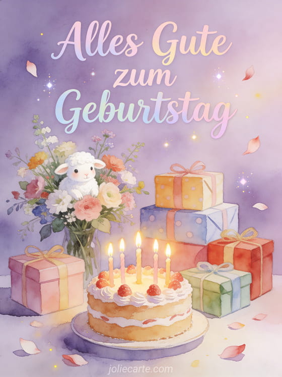 Erfreuen Sie jemanden zum Geburtstag mit dieser entzückenden Aquarellkarte mit einem niedlichen weißen Lämmchen umgeben von bunten Geschenken und einem Kuchen mit brennenden Kerzen. Entdecken Sie auch eine kostenlose animierte Geburtstagskarte oder eine animierte Geburtstagskarte für Jungen.
