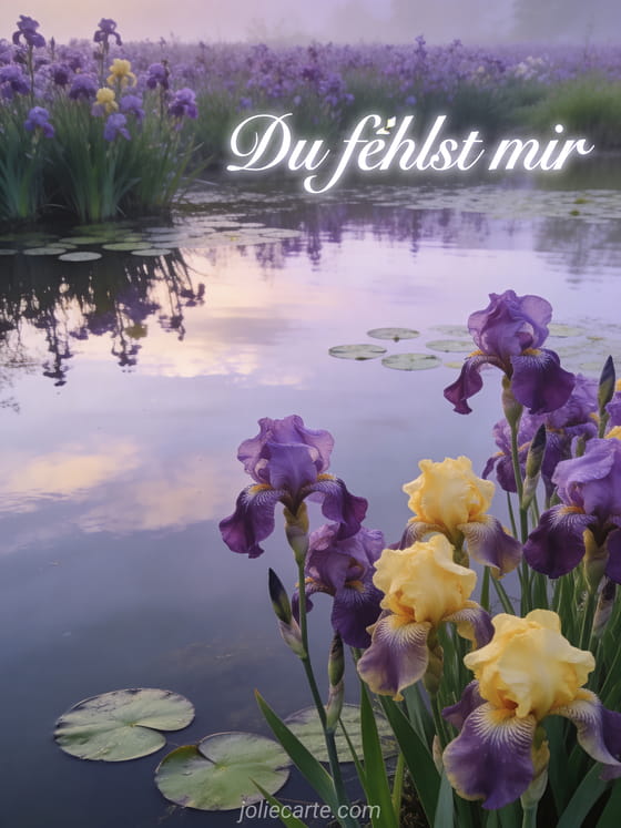 Sende diese schöne Karte mit dem Text Du fehlst mir in eleganten weißen Buchstaben, mit einem Feld aus violetten und gelben Iris an einem stillen Teich unter einem sanften Morgenhimmel. Entdecke auch eine Karte du fehlst mir ein bisschen oder eine Karte du fehlst mir ich denke an dich.