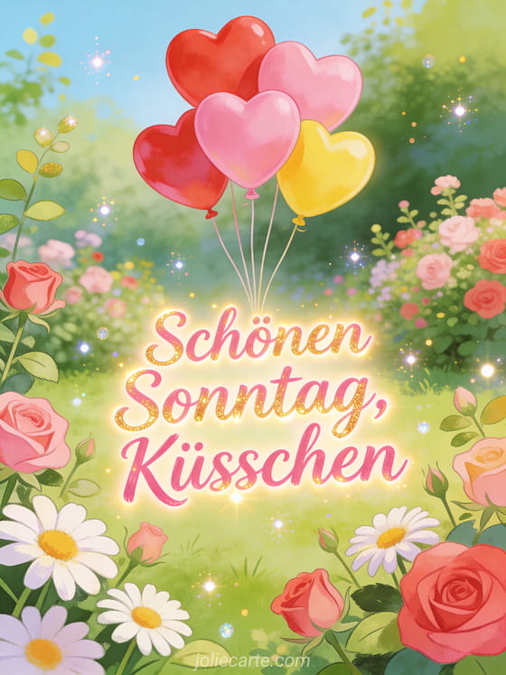 Sende Küsschen zum schönen Sonntag mit einem Bündel herzförmiger Ballons, das über blühenden Gärten in einer sonnigen Farbwelt aufsteigt. Entdecke auch schöne Karte schönen sonnigen Sonntag, schönen regnerischen Sonntag oder schönen Sonntag animierte GIFs.