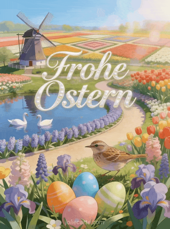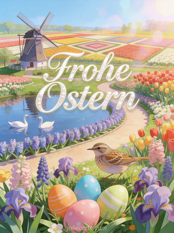 Teilen Sie eine bezaubernde Frohe-Ostern-Karte mit einem Pipit zwischen bunten Ostereiern in einem Tulpengarten. Entdecken Sie auch eine kostenlose Osterkarte oder eine Osterkarten Vorlage.