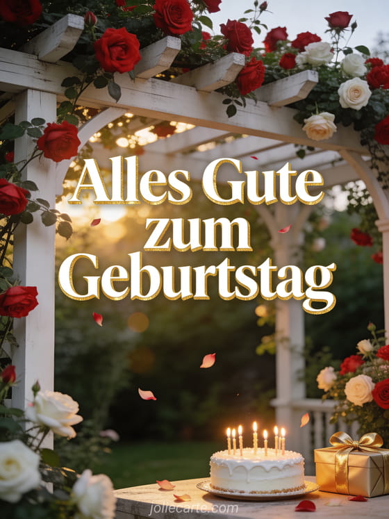 Teile diese elegante Geburtstagskarte mit Rosenpergola und liebevollen Details. Entdecke auch schöne kostenlose Geburtstagskarte Mann Dromedar, geburtstag mann kostenlos und geburtstag mann auto.