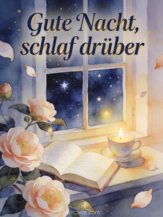 Sende eine schöne Gute-Nacht-Nachricht mit eleganter mitternachtsblauer Schrift, warmem Kerzenlicht und einer ruhigen Leseszene. Diese kostenlose Karte begleitet die Nacht mit einem offenen Buch, einer Tasse, Kamelien und Sternen am Fenster. Entdecke auch eine Gute-Nacht-Nachricht für ihn Karte, eine Nachricht zum Wünschen einer guten Nacht Karte oder eine kleine Nachricht um gute Nacht zu sagen Karte.
