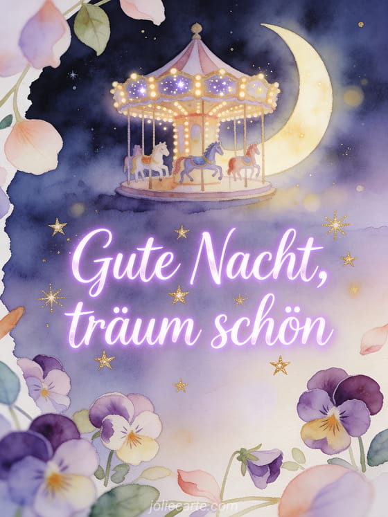 Sende eine schöne gute nacht nachricht mit lila Schrift, kleinen goldenen Sternen, einem Karussell unter der Mondsichel und Stiefmütterchen über dem Rand. Dazu passen auch diese schöne Nachricht um Gute Nacht zu sagen, diese gute-nacht-nachricht für ihren mann oder diese sanfte Gute-Nacht-Nachricht.
