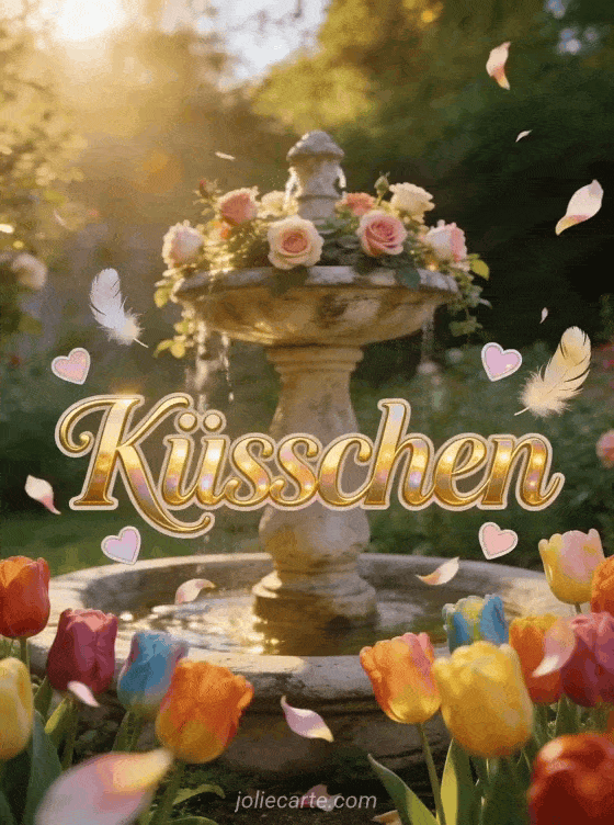 Teile süße Küsschen mit dieser wunderschönen Garten-Grußkarte voller Rosen und Tulpen. Entdecke auch gif fisch küsschen oder küsschen senden für mehr liebevolle Grüße.