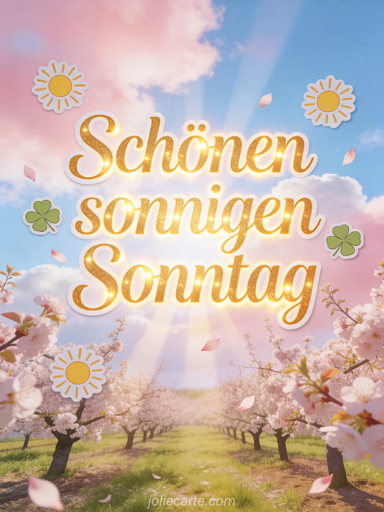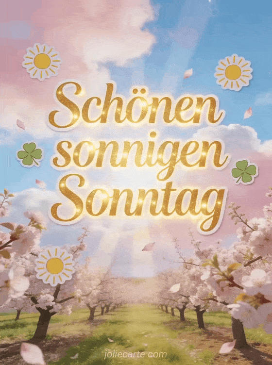 Verschicke einen fröhlichen Gruß für einen schönen sonnigen Sonntag mit eleganter goldener Schrift, strahlenden Sonnen-Stickern, schwebendem vierblättrigem Klee und einem blühenden Pflaumenhain unter pastellrosa und blauem Himmel. Dazu passen auch dieser schönen regnerischen Sonntag, diese schönen Sonntag animierte GIFs oder diese Guten Morgen Sonntag Karte.