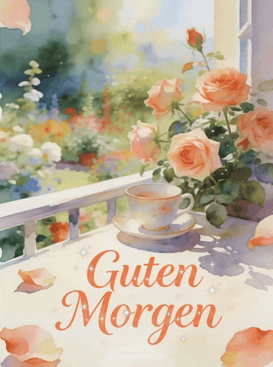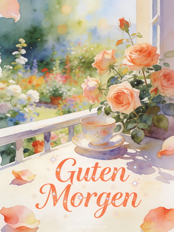 Sende eine schöne kostenlose virtuelle Guten-Morgen-Karte mit eleganter korallfarbener Aquarellschrift, einer Porzellantasse, blühenden alten Gartenrosen und einem hellen Balkonsims. Entdecke auch kostenlose virtuelle Guten Morgen Karten, Guten Morgen und beste Wünsche oder kleine Nachricht zum Guten Morgen.