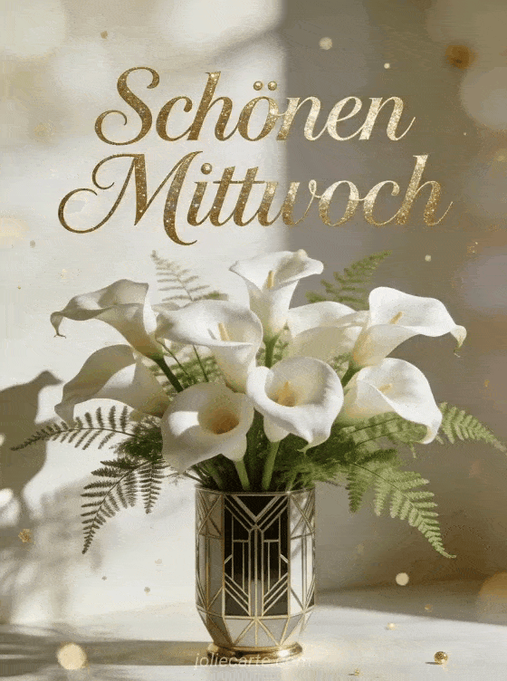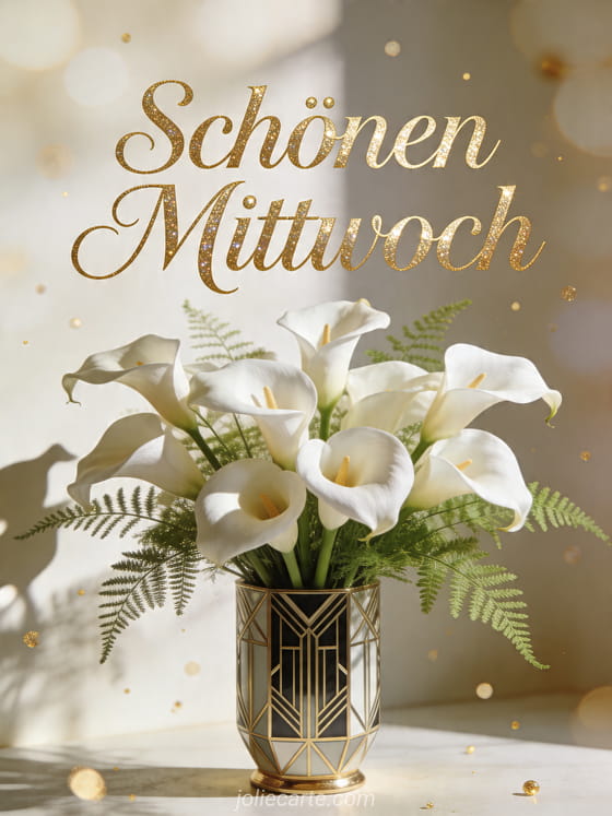 Verschicke eine Schönen-Mittwoch-Karte mit weißen Calla-Lilien und raffiniertem Art-déco-Stil. Entdecke auch lächeln tag lächeln schönen mittwoch, bild regnerischer mittwoch und foto guten morgen schönen mittwoch.