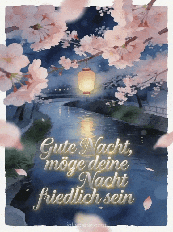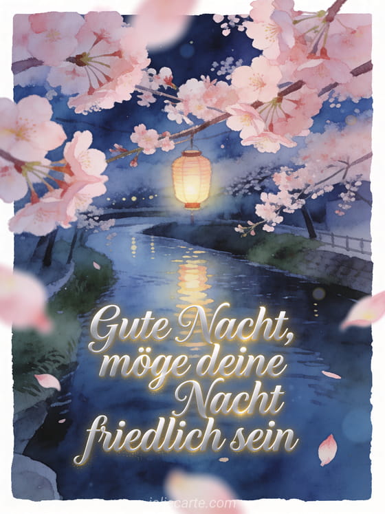 Sende eine friedliche Gute-Nacht-Nachricht mit einem langsam fließenden Fluss, hängendem Laternenlicht und Kirschblüten im Vordergrund. Entdecke auch gute-nacht-nachricht für ihren mann, sanfte Gute-Nacht-Nachricht oder Gute-Nacht-Nachricht für seine Freundin.