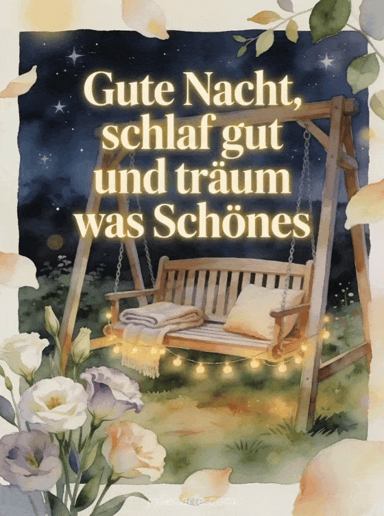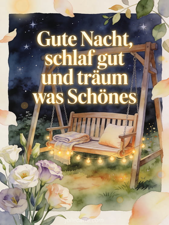 Teile eine friedliche Gute-Nacht-Karte mit einer Holzschaukel im Garten, einer gefalteten Decke, einem weichen Kissen, Lichterketten und Lisianthusblüten unter einem Sternenhimmel. Du kannst auch eine Nachricht um seiner Frau gute Nacht zu wünschen, eine Nachricht um seiner Freundin gute Nacht zu wünschen oder eine kostenlose Gute-Nacht-Karte senden.