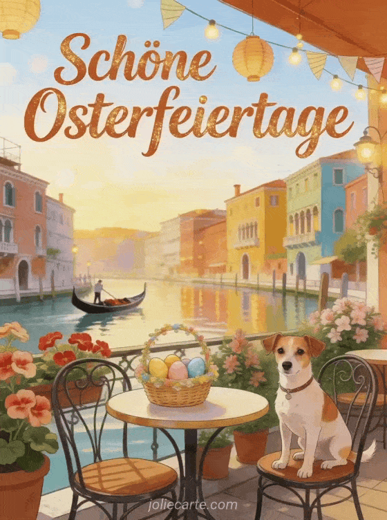 Versenden Sie schöne Osterfeiertage-Bilder mit einer venezianischen Kanal-Terrasse voller bemalter Ostereier. Entdecken Sie auch einen Ostertext oder ein animiertes Oster GIF.
