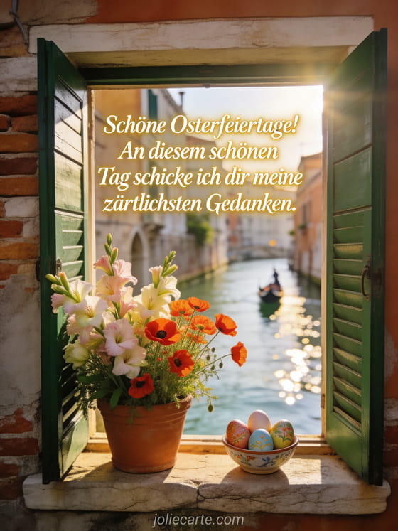 Sende diesen zĂ€rtlichen Ostertext mit einer venezianischen Szene voller FrĂŒhlingsblumen. Entdecke auch eine OstergruĂkarte Text oder eine Osterbotschaft.